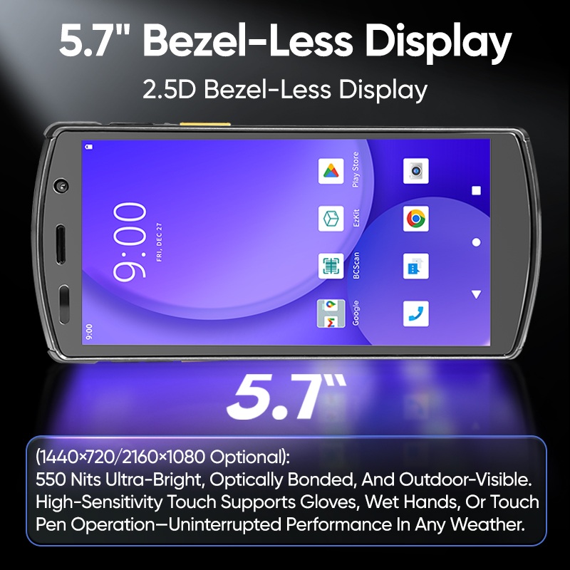 2.5D безрамочный дисплей (опционально 1440×720/2160×1080): сверхъяркий, с оптической связью, обеспечивающий видимость на открытом воздухе, яркость 550 нит. Высокочувствительный сенсорный экран поддерживает работу в перчатках, мокрыми руками или с помощью стилуса — бесперебойная работа в любую погоду.