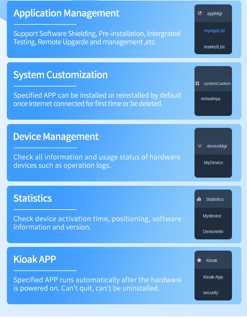Specified APP runs automatically after the hardwareis powered on. Can't quit, can't be uninstalled.