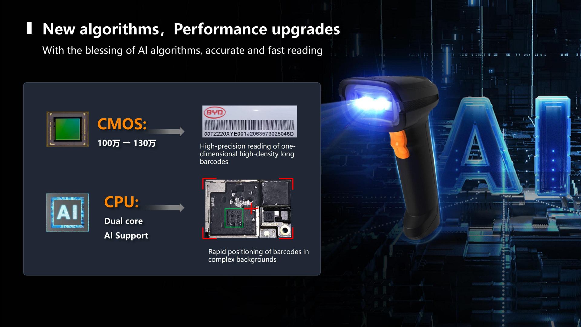 2. Двухъядерный процессор с высокой скоростью обработки и поддержкой искусственного интеллекта. Процессор значительно усовершенствован по сравнению с одноядерным предшественником и стал двухъядерным. Благодаря возможности декодирования 1,3 млн бит, он может считывать длинные одномерные штрихкоды высокой плотности. Благодаря поддержке искусственного интеллекта, обученного на более чем сотнях тысяч штрихкодов, он может быстро захватывать штрихкоды и точно их декодировать.