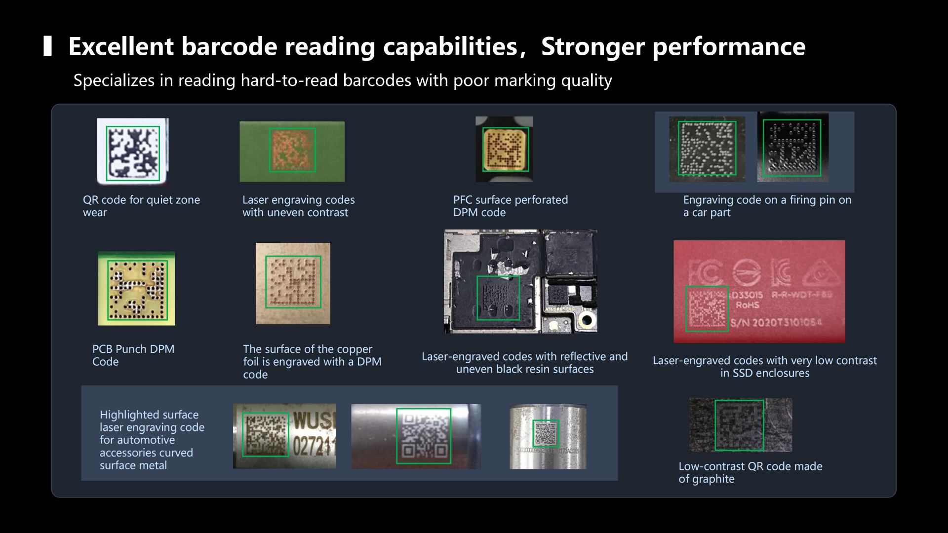 Специалист по считыванию DPM-кодов с такими проблемами, как стертые QR-коды в тихих зонах, лазерно-гравированные коды с неравномерным контрастом, перфорированные FPC DPM-коды, ударно-точечные коды на автозапчастях, низкоконтрастные графитовые QR-коды, перфорированные печатные платы DPM-кодов, DPM-коды, выгравированные на медной фольге, лазерные коды на ярком дуговом металле для автозапчастей и неровные, отражающие черные полимерные QR-коды на корпусах SSD.