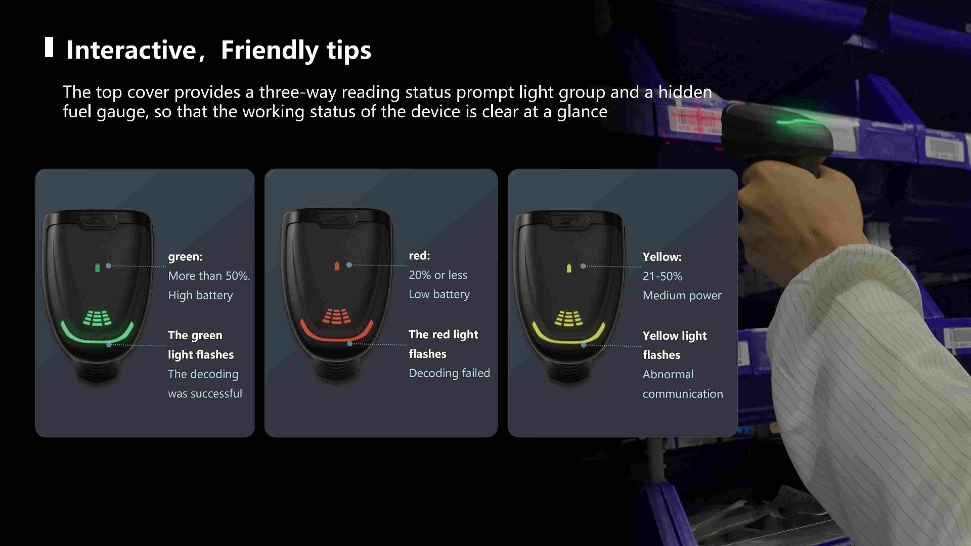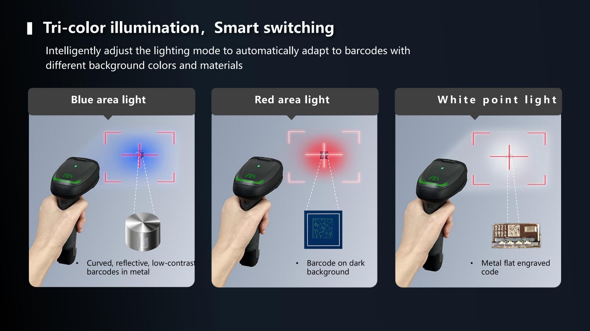 Беспроводной сканер штрихкодов FS325DP может интеллектуально регулировать свой режим подсветки — синий, красный или белый — для автоматической адаптации к штрихкодам с различными цветами фона и материалами.