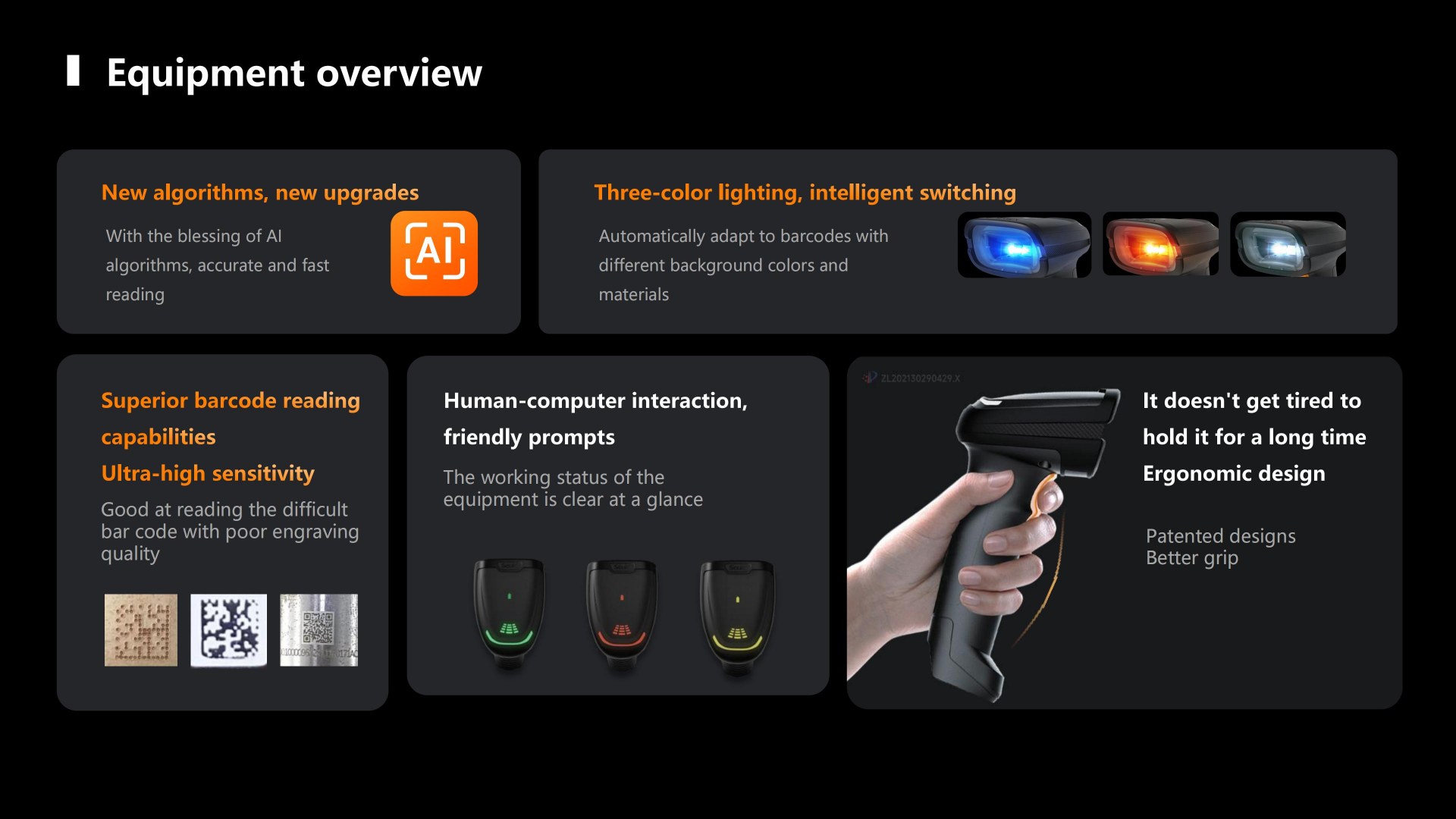 1. F325DP — промышленный беспроводной сканер штрихкодов с мощными возможностями декодирования DPM. Он эффективно устраняет такие проблемы, как искажение, деформация, точечность, размытость, дефекты и низкий контраст DPM-кодов. Благодаря быстрому двухъядерному процессору и передовому алгоритму распознавания на базе искусственного интеллекта, сканер обеспечивает более плавное и интеллектуальное декодирование.